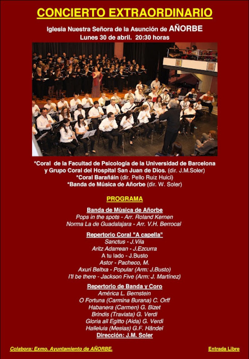 Tras su actuación este fin de semana en La Antigua de Zumárraga, Coral Barañáin retomará el repertorio de sus actuaciones en Barcelona para ofrecer un concierto extraordinario esta tarde en Añorbe, junto a los coros de la Facultad de Psicología de la Universidad de Barcelona, la Coral Hospitalaria de San Juan de Dios y la Banda de Añorbe. Será a las 20,30 en la iglesia de la Asunción de Añorbe. Entrada libre.